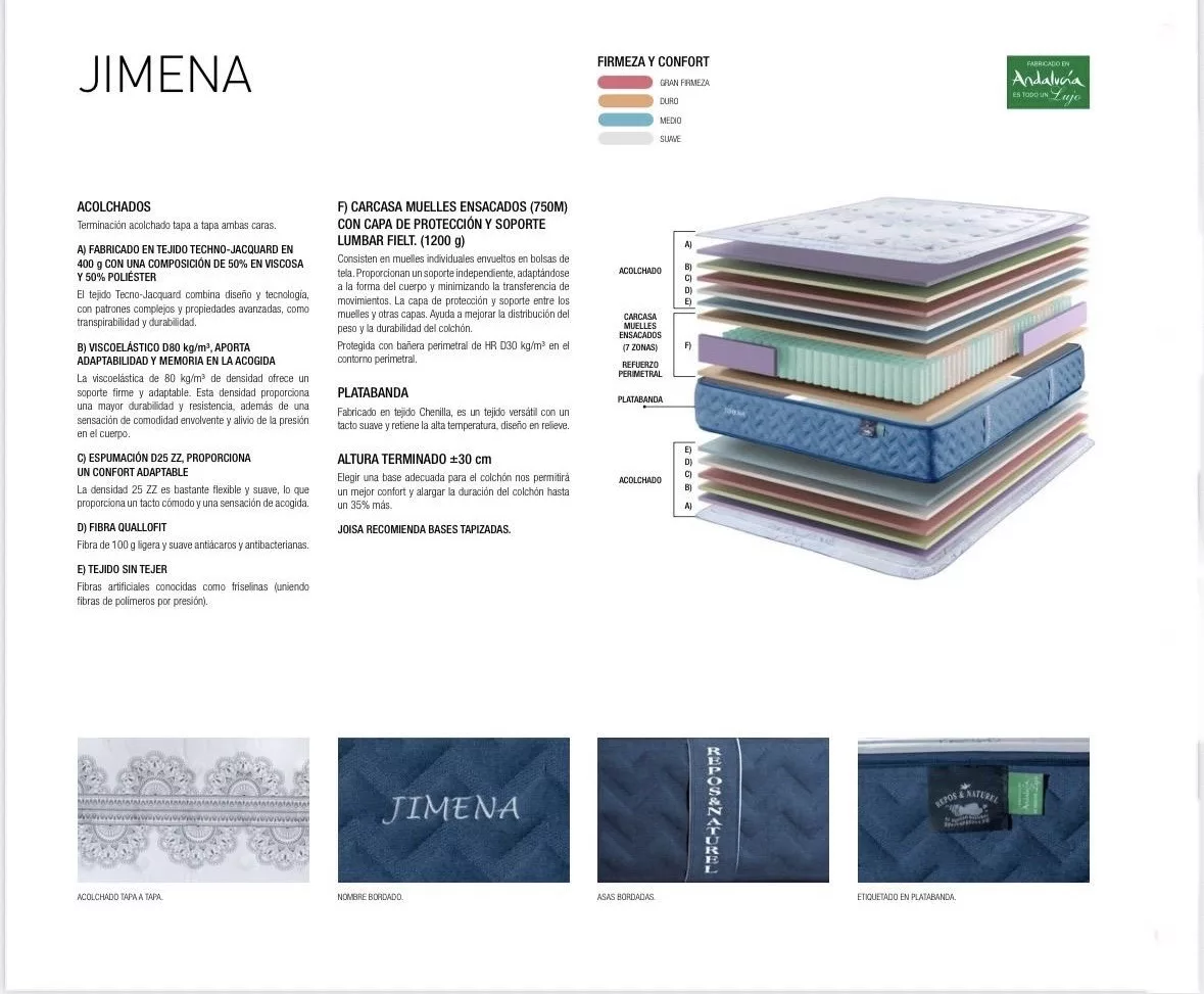El Colchón JIMENA cuenta con un sistema de muelles ensacados, actúan de forma independiente entre si de un modo único. Cuando el peso recae en un solo muelle, los muelles adyacentes apenas se ven afectados.