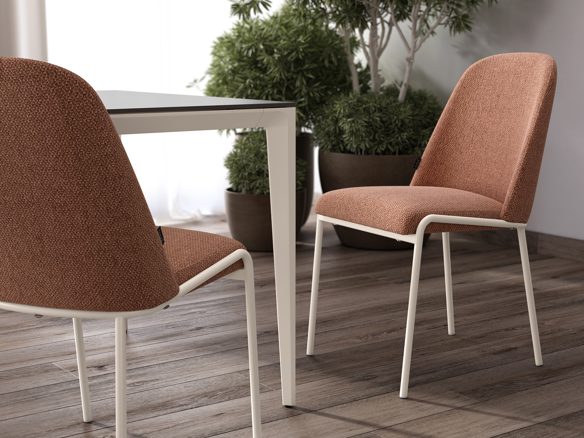 Silla con respaldo y asiento tapizado . Patas metálicas marfil.